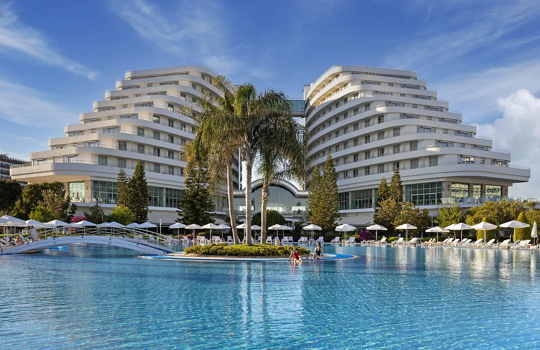 Miracle Resort Hotel, a 5-star Antalya hotel with an 8.5/10 rating on Booking.com, features a private beach area and a range of indoor and outdoor pools. The hotel operates under an All-Inclusive system, providing 24-hour service and multiple dining options.
