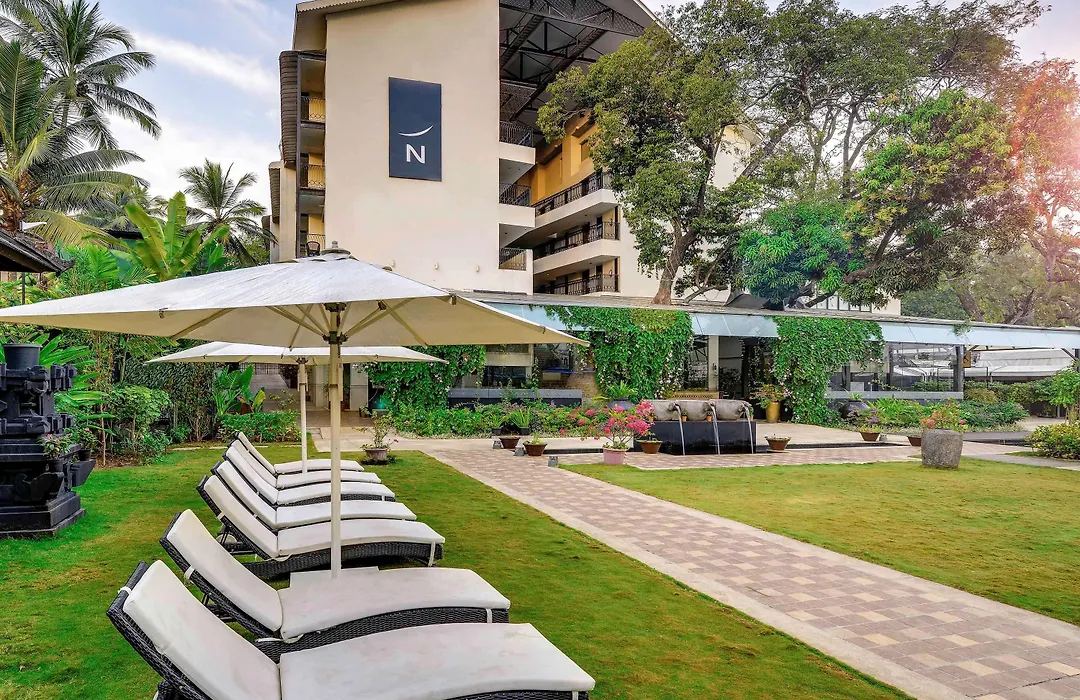 Novotel Goa Resort & Spa Candolim, a 5-star property rated at 7.6/10, features a modern resort setting known for its greenery and tranquil spaces. The hotel offers amenities such as a full-service spa and a kids club, making it family-friendly.