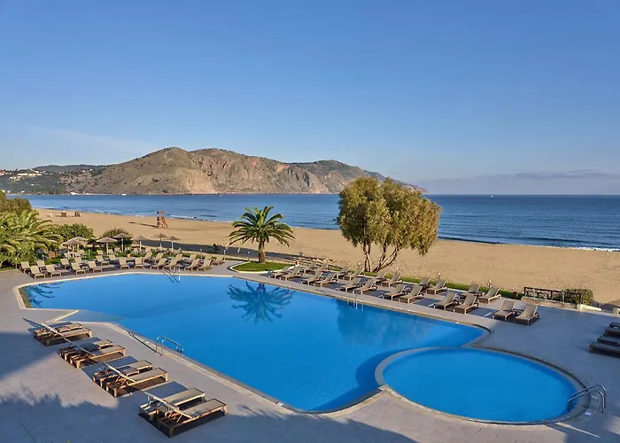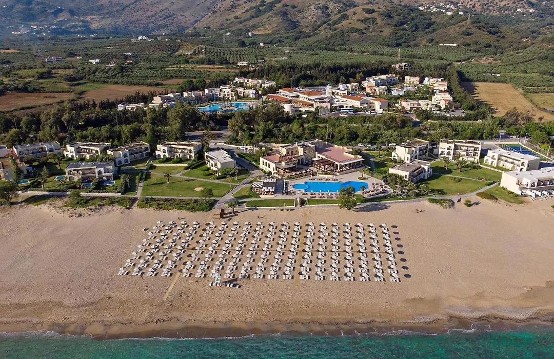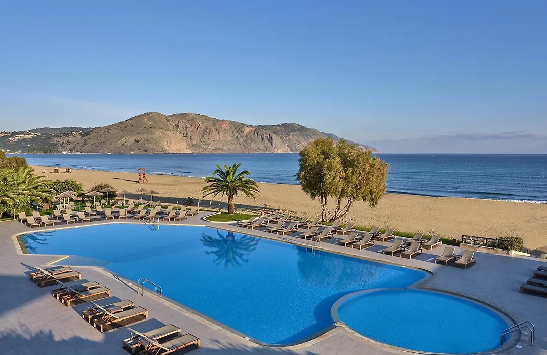 Pilot Beach Resort, a 5-star hotel with an 8.9/10 Booking.com rating, is set on a sandy beach surrounded by olive and avocado trees. Offering spacious public areas with unique Cretan architecture, it features five swimming pools and extensive health and leisure facilities.