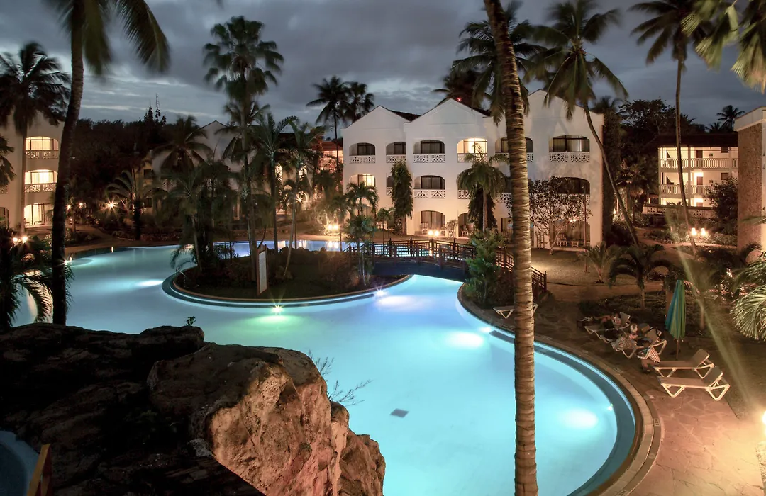 Sarova Whitesands Beach Resort & Spa is a luxury 5-star beach hotel situated along the pristine shores of Mombasa, offering world-class facilities for both families and corporate travelers. It features five swimming pools, a robust wellness spa, and multiple dining options, all nestled among lush gardens and towering palms.