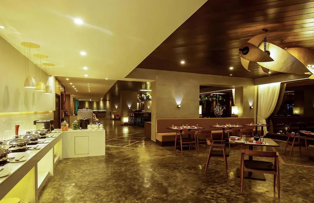 Dining options include a restaurant serving American, Chinese, and Indian cuisine, alongside the restobar offering multicuisine delicacies. Guests can enjoy al fresco dining with tropical drinks and ocean views.