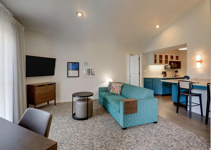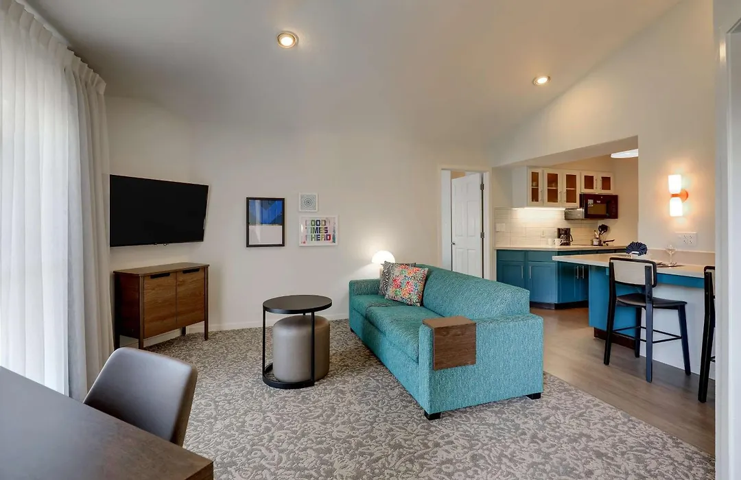 The hotel features one and two bedroom suites designed like spacious apartments. Each suite includes kitchens with full-sized refrigerators and stovetops, providing guests with a home-like experience.