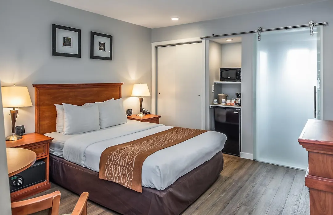 Rooms at The Inn At 1252 Monterey offer modern amenities, including flat-screen TVs, microwaves, and refrigerators. Family suites are available, featuring multiple beds and connected rooms for added privacy. Free Wi-Fi is provided throughout the hotel.